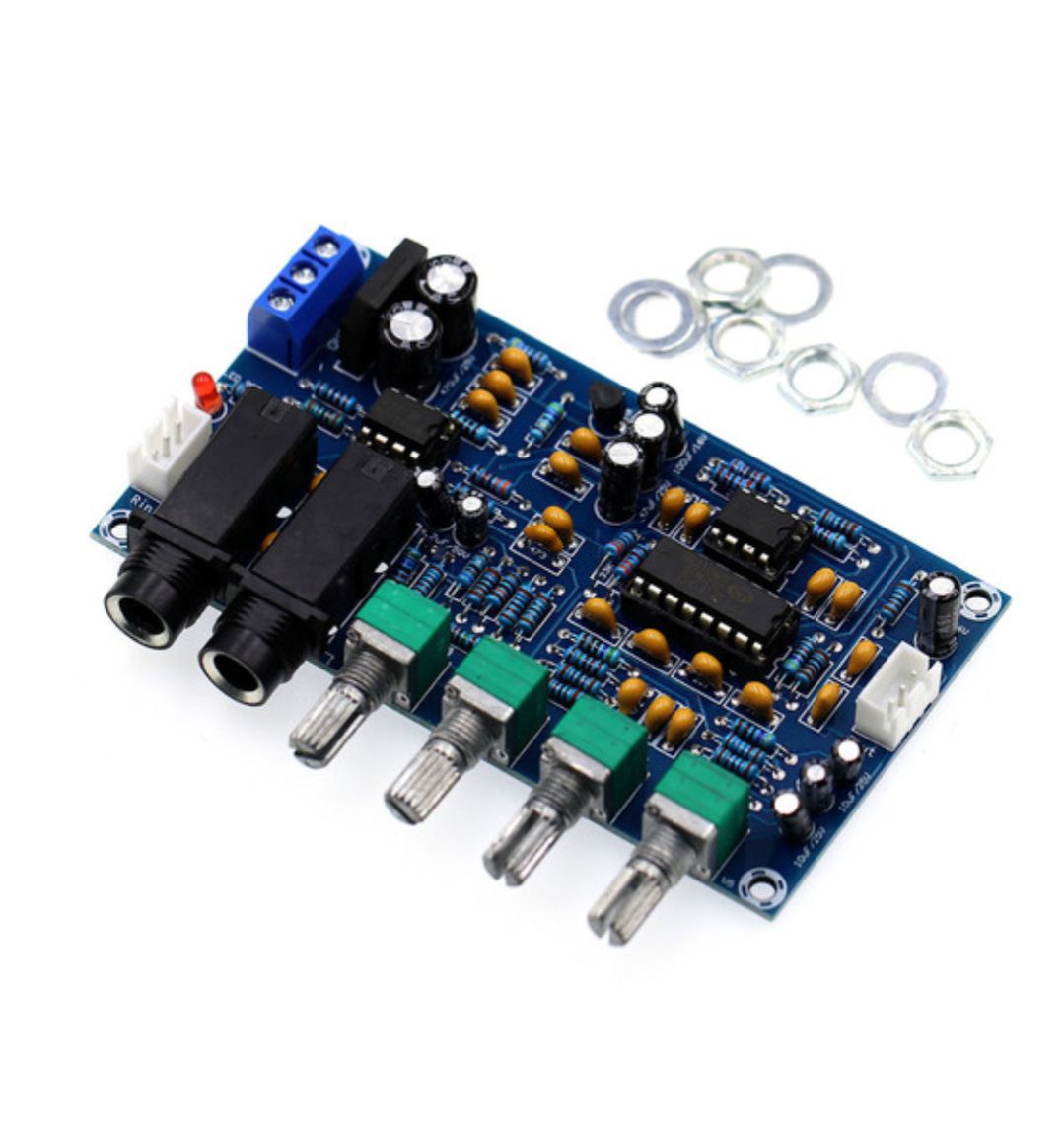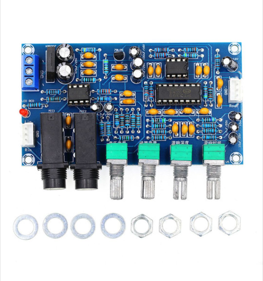 Product Wiring: Lin GND Rin: respectively indicates the left channel in the audio input signal, the ground line, the right channel Lout GND Rout: respectively indicates the left channel in the audio output signal, the ground line, the right channelMICI MIC2: used to connect the microphone, the connector of the microphone can be directly plugged in.Music volume knob: used to adjust the sound quality of background music (accompaniment)Microphone volume knob: used to adjust the size of the microphone soundReverb depth knob: used to adjust the size of the microphone soundReverberation time knob: used to adjust the playback time of the microphone soundPackage.