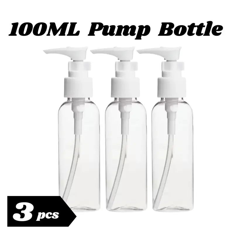 This set includes 3 pcs clear 100 ml plastic pump bottles with white pump tops that provide controlled, mess‑free dispensing with each press. The compact 100 ml size is travel‑friendly and perfect for organizing personal care or cleaning liquids in your bag, bathroom, or salon.