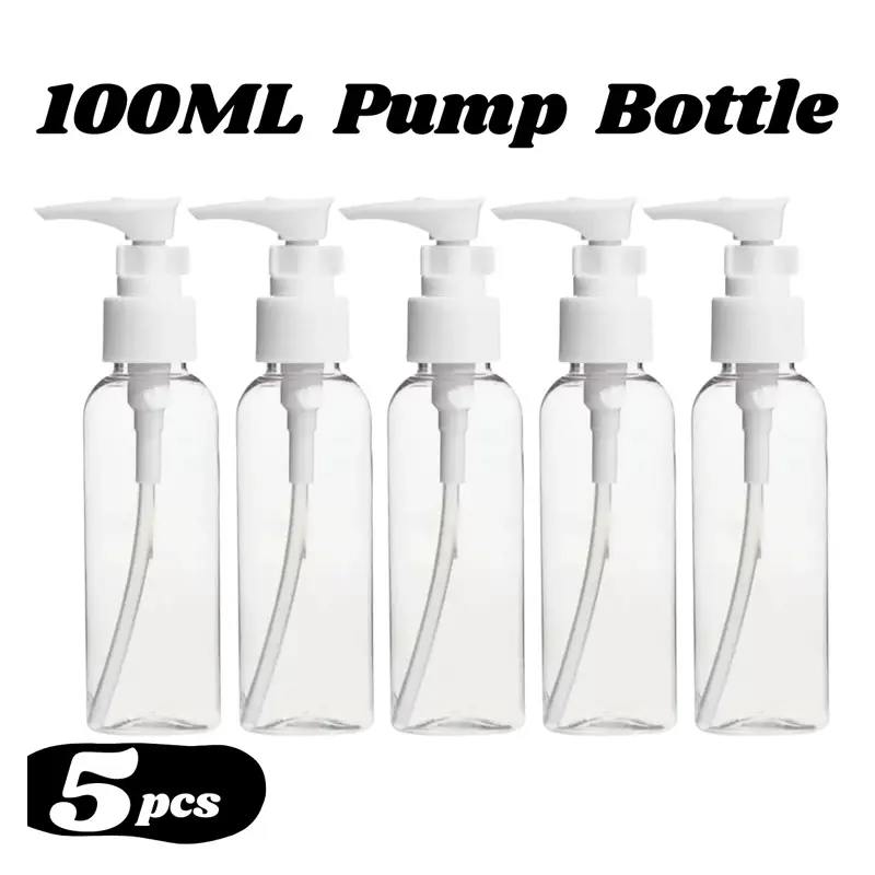 This set includes 5 pcs clear 100 ml plastic pump bottles with white pump tops that provide controlled, mess‑free dispensing with each press. The compact 100 ml size is travel‑friendly and perfect for organizing personal care or cleaning liquids in your bag, bathroom, or salon.