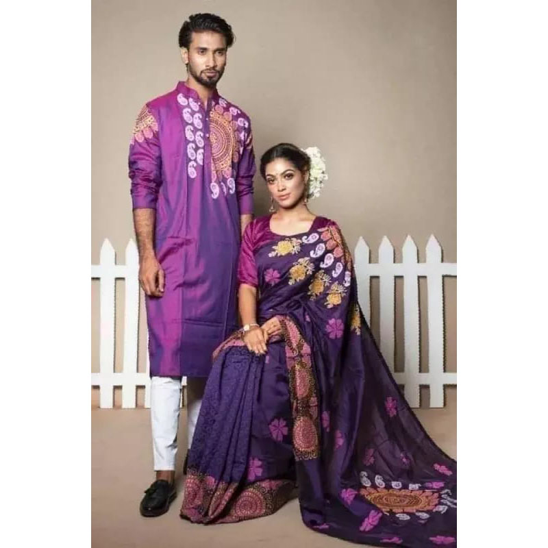 Purple Block Print Reshmi Silk Saree and Dupaiyan Panjabi couple Dress for Men and women