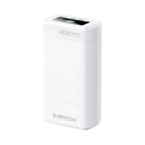 Remax RPP-310 Dinba Series 65W PD+QC Fast Charging Power Bank Product color: White Product battery: Li-Polymer Battery Product material: ABS + PC Net weight: ≈ 920g Product capacity: 40000mAh/148Wh/3.7VRated capacity: 21600mAh 5V=3A Product size: 160*84*48mmInput: Type-C1: 5V/3A,9V/3A,12V/3A,15V/3A,20V/3.25A (65W)Output: Type-C1: 5V/3A,9V/3A,12V/3A,15V/3A,20V/3.25A (65W)