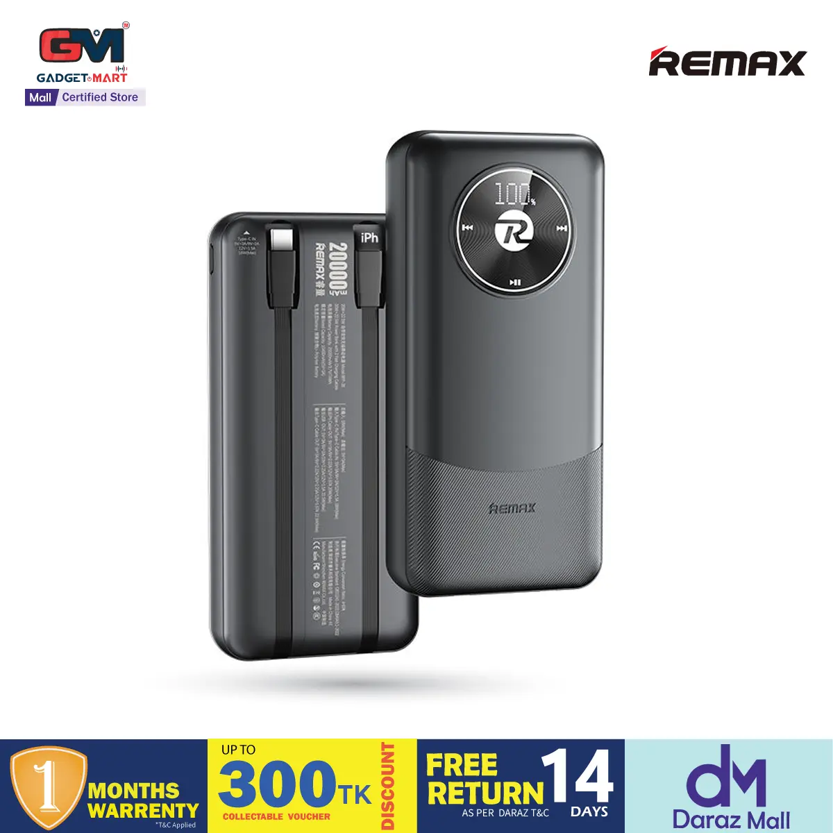 REMAX RPP-38 20W+22.5W Built-in Dual Fast Charging Cables 20000mAh Power Bank - Black