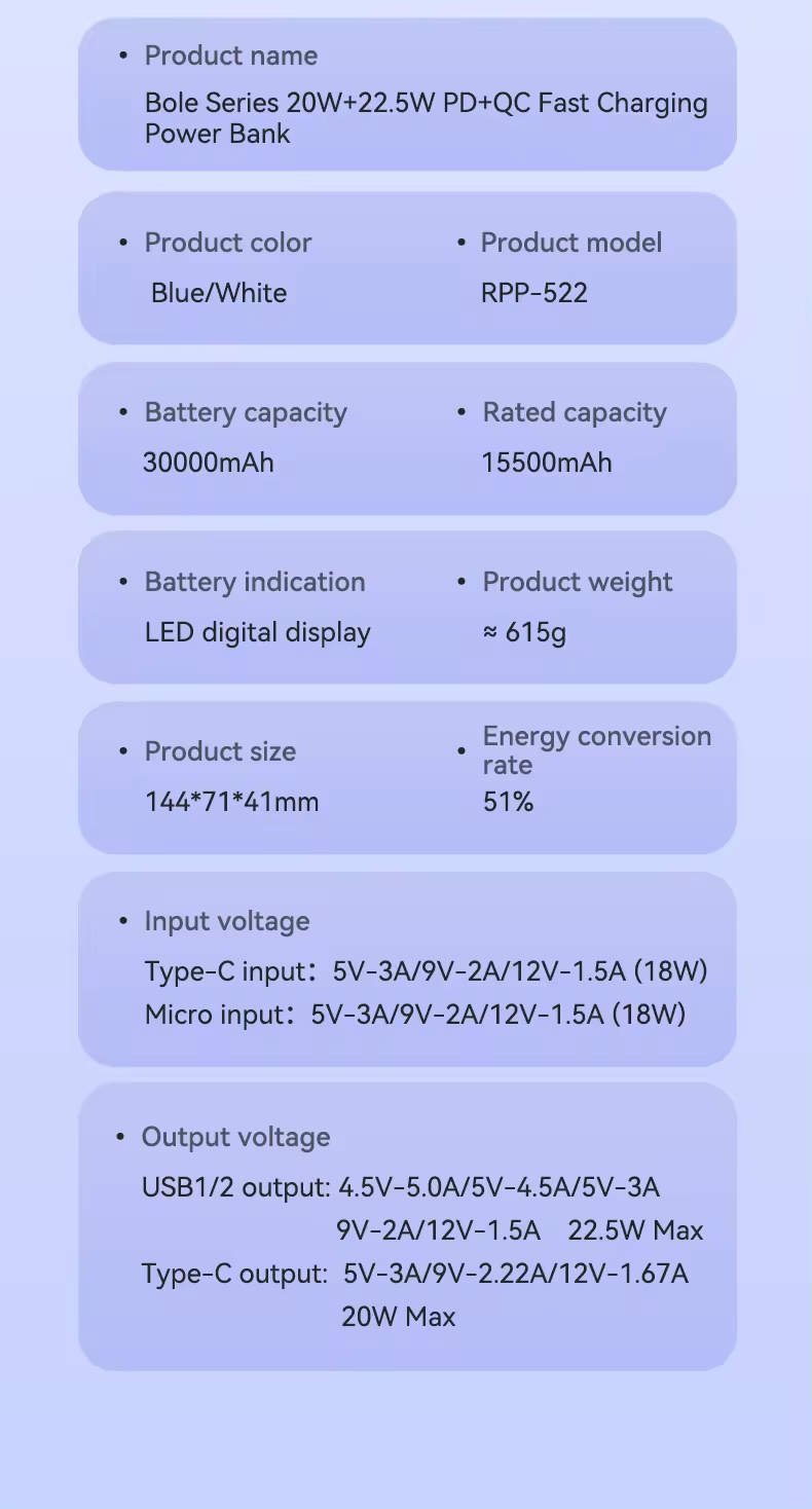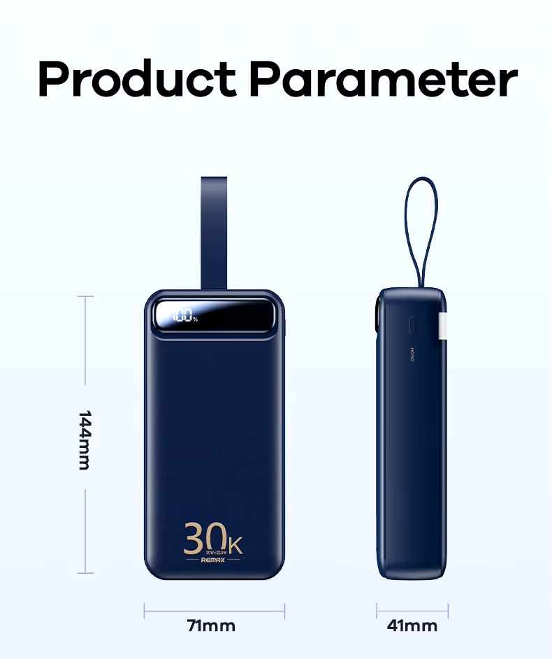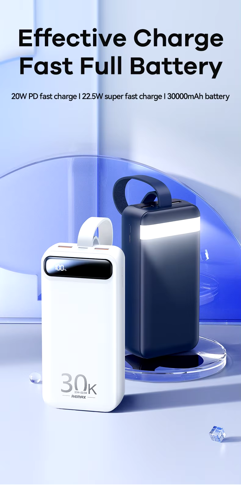 This Remax power bank provides a robust 30000mAh capacity, supporting PD20W and QC22.5W fast charging for quick device replenishment. Its LED display ensures real-time monitoring, while multiple interfaces including Type-C, USB, and Micro USB offer versatile connectivity. Designed for outdoor use with an ultra-slim build, it combines portability and durability. Equipped with protections against overcharging, short circuits, and over-discharging, it ensures reliable performance. Flexible MOQ and customization options make it ideal for bulk procurement.