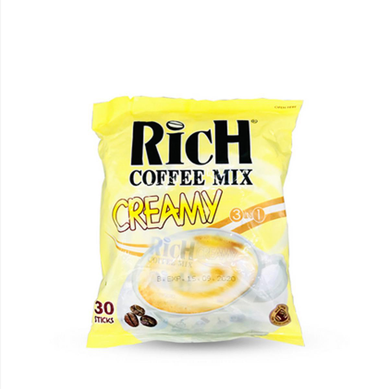 Rich 3in 1 coffee mix creamy- 540gm=1Box=(18gX30sticks) 3in 1 creamy coffee mix. Blends seleted coffee powder with perfect creamy creamar enabling you feet the unforgettable creamy experience with perfect taste and arma.- ISO 9001: 2008 and UKAS approved.-