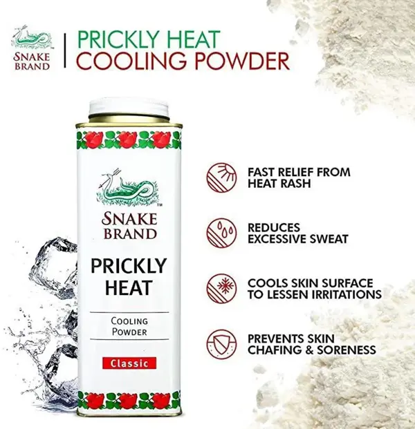 Snake Brand Prickly Heat Original Cooling Powder Classic provides instant relief from prickly heat and heat-related discomfort.