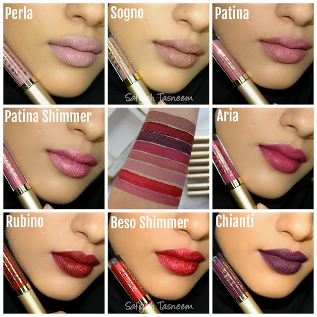 Perla - pale dusty pinkSogno - warm rose (new)Patina - dusty rose Patina Shimmer - dusty rose with shimmer (new)Aria - magenta plumRubino - beet redBeso Shimmer - true red with shimmer (new)Chianti - deep plum