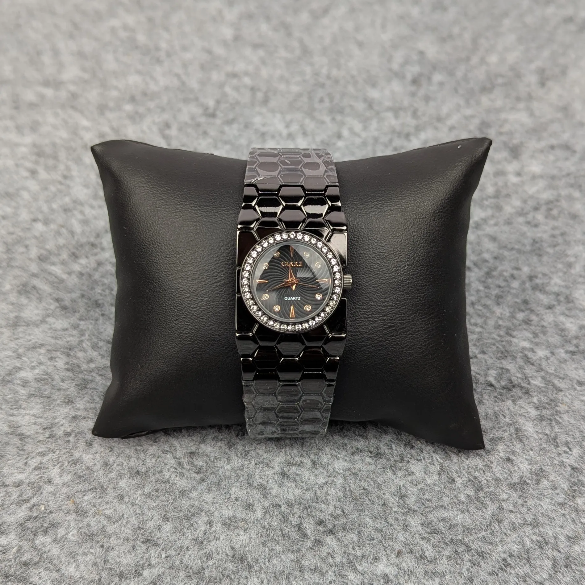 Stylish Black Ladies Quartz Watch with Crystal Bezel – Premium Bracelet Design (Black Dial)✨ This is an attractive and stylish ladies’ watch.Product Description: Type: Ladies Quartz WatchDesign: Round dial with sparkling crystal-studded bezelColor: GoldenStrap: Premium metallic bracelet with honeycomb patternDial: Golden shade with quartz movementStyle: Perfect for parties, daily wear, or giftingSpeciality: Lightweight, stylish, and long-lasting design👉 A fashionable choice for women who love elegance and sophistication. 🔑 Meta Keywords:Luxury Ladies Watch, Golden Quartz Watch, Stylish Women’s Wrist Watch, Stone Studded Watch, Fashionable Women Watch, Elegant Ladies Quartz, Party Wear Watch, Premium Women Wrist Watch, Golden Bracelet Watch, Trendy Ladies Watch