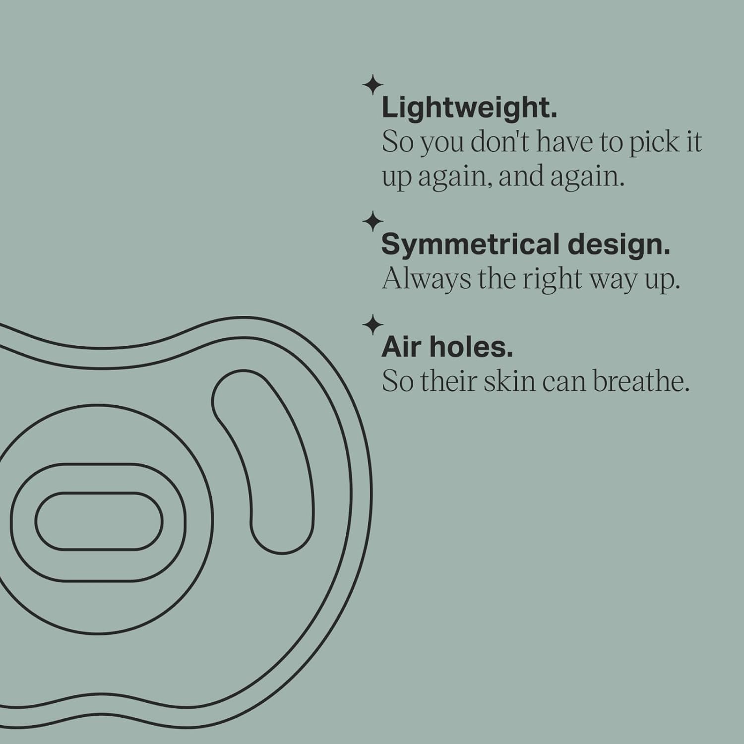 The lightweight soother that stays put in their mouth, so you don’t have to pick it up again and again (and again). • The lightest one-piece silicone soother* • Symmetrical silicone teat (so it always sits the right way up) • Air holes so their skin can breathe • 100% BPA free, medical grade silicone • Available in 3 age stages: 0-6, 6-18, and 18- 36 months • Orthodontic** *Assessed on readable retail sales accounting for 98% of UK soothers category and 95% of US pacifier category (0-6m size), Nov 2023. ** As compared to traditional round unvented soothers which do not compress as easily