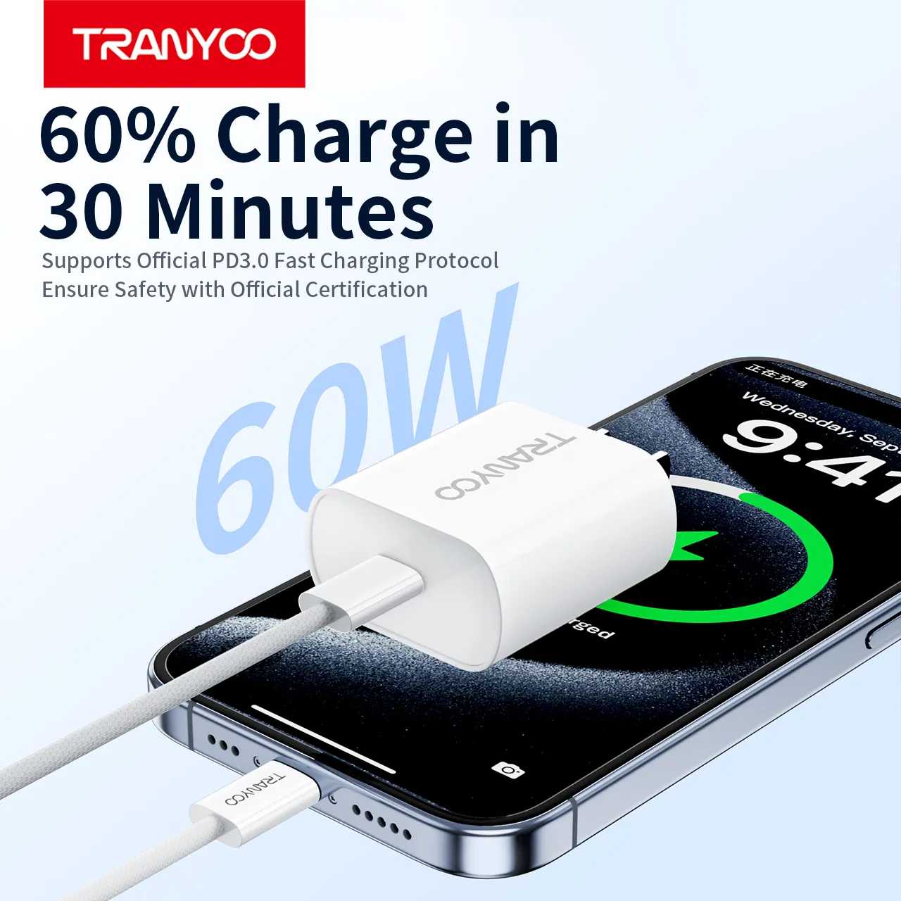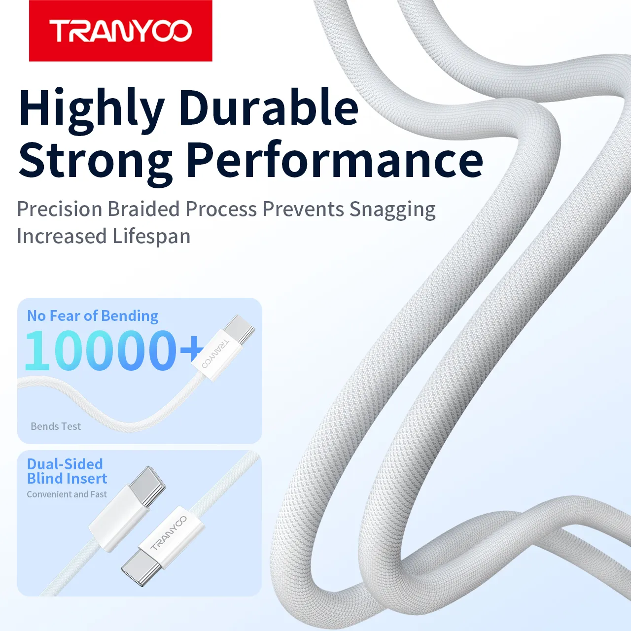 The Tranyoo CC‑15 is a premium USB‑C to USB‑C data and charging cable engineered for high-speed performance. Designed to deliver up to 60 W Power Delivery (PD) and support up to 5 A current output, it ensures ultra-fast charging for modern smartphones, tablets, and laptops. Built for durability, the cable features a sturdy braided exterior and reinforced connectors designed to resist wear, tangling, and breaking—even with daily use.