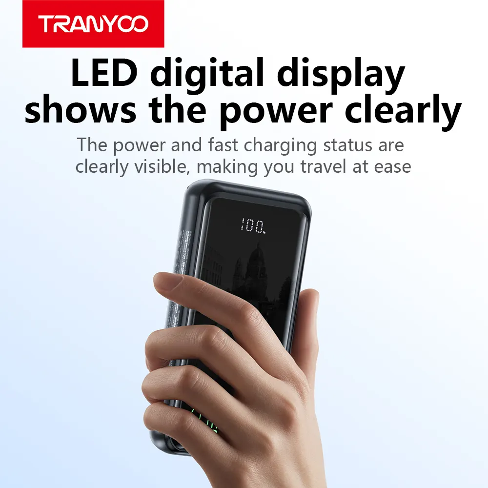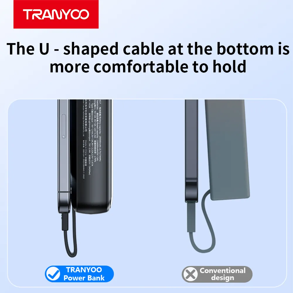 Tranyoo T-K17 is a high-performance 20000mAh fast charging power bank, engineered for modern mobile users. With 22.5W max output and built-in Type-C and Lightning cables, it offers hassle-free charging for both Android and iPhone users—no need to carry separate cables.