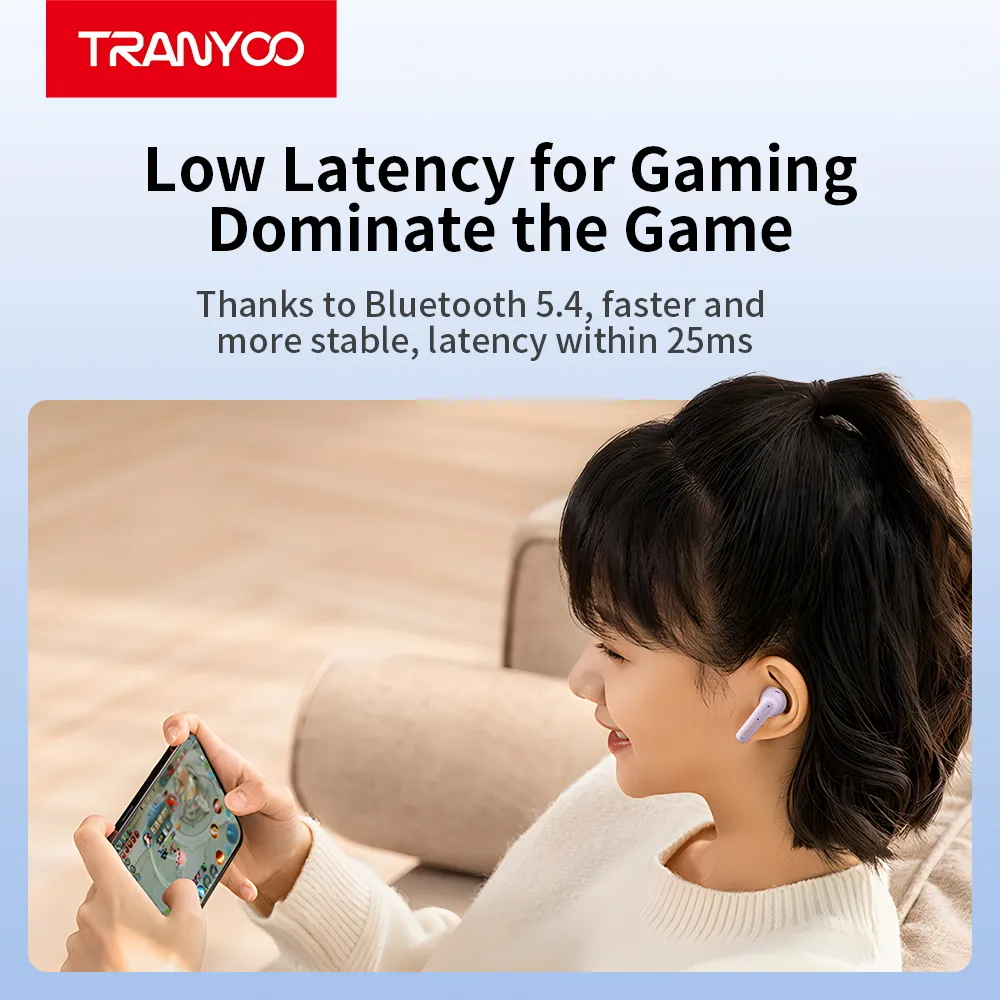 The Tranyoo T-M2 are value-focused Bluetooth 5.4 true wireless earbuds featuring ANC for music and ENC for clear calls. Powered by the JL7006F8 platform, they add a low-latency game mode for smoother audio-video sync. A compact 250mAh case tops up the 35mAh buds, delivering about 7 hours of listening per charge (~50h standby). Charge via USB-C, and take them out in light rain or workouts thanks to retailer-rated IPX4 protection. Ideal for commuters, students, and casual gamers using Android or iPhone in Bangladesh.