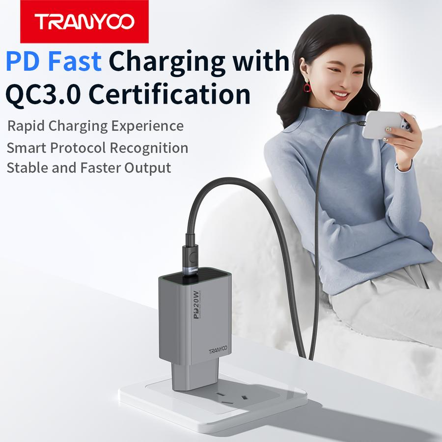 The Tranyoo T‑EU7L is a dynamic charging solution catering to iPhone and iPad users who require 20 W fast charging performance with an integrated USB‑C to Lightning cable. Engineered to deliver either 5V/3A or 9V/2.22A, this adapter charges up to 50% capacity in just 30 minutes for compatible Apple devices.