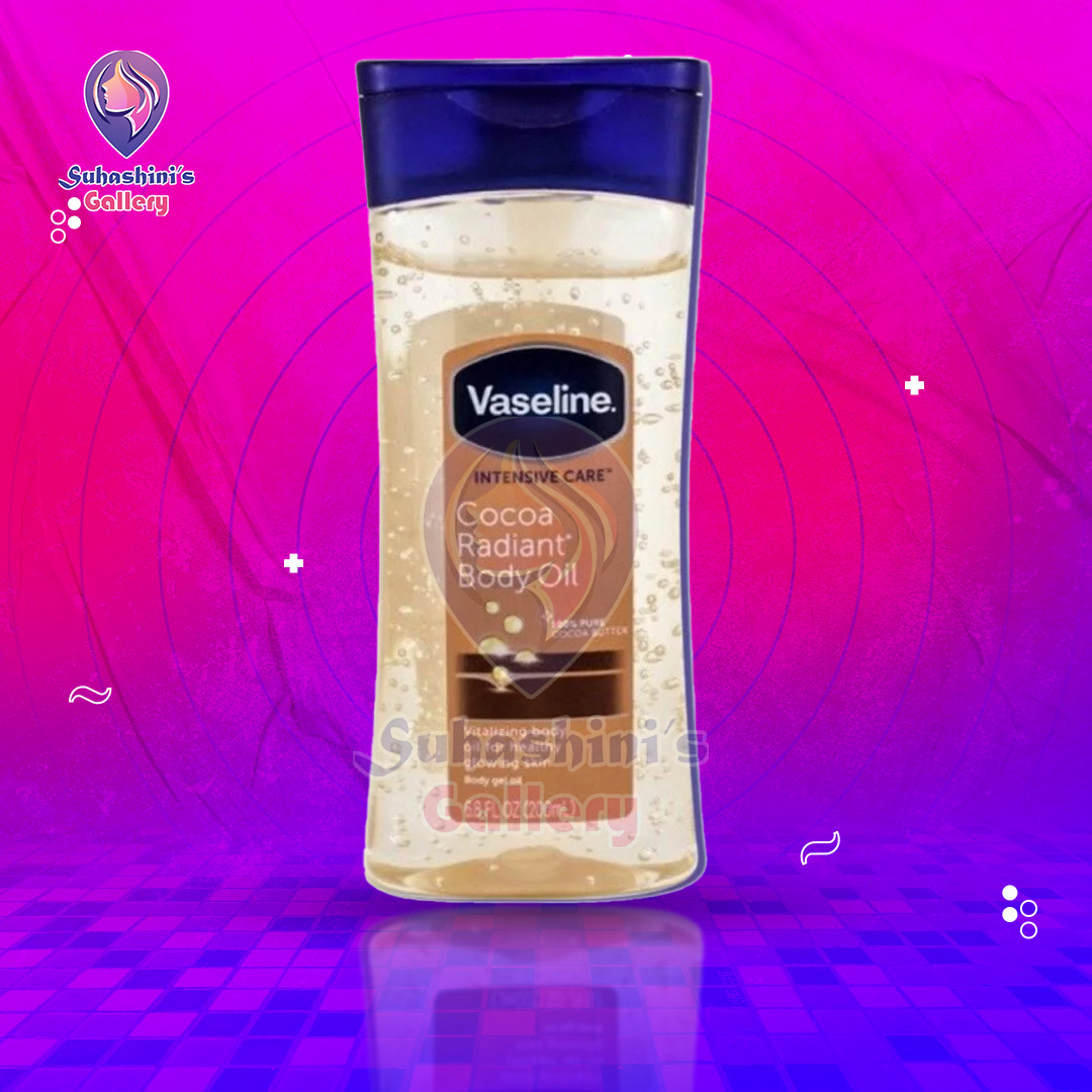 Vaseline Intensive Care Cocoa Radiant Body Gel Oil is a luxurious blend of pure cocoa butter and micro-droplets of Vaseline Jelly, designed to deeply moisturize and nourish dry skin. This body gel oil locks in moisture to reveal glowing, healthy-looking skin. Its lightweight, non-greasy formula absorbs quickly, leaving your skin soft, smooth, and radiant with a subtle cocoa fragrance. Ideal for daily use, it provides long-lasting hydration and a luminous glow.