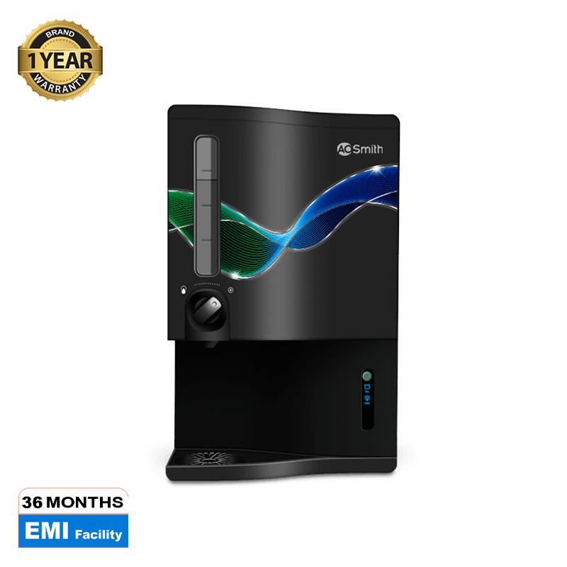 Upto 15 litres per hour Storage tank capacity : 10 litres (approx.) Purification technology : RO +SCMT(Silver charger membrane technology) Purifying Technology : 7 Purification Stages Pre Filter, Sediment Filter, Pre Carbon Filter, Ro Membrane, Min-Tech (Mineraliser Technology), Silver Activated Post Carbon, Uv Membrane type : Thin film composite RO membrane Material of construction for plastic parts : Food safe, non-toxic, engineering grade plastics Input Voltage range : 150-300VAC, 50Hz V Power rating (Max) : 60 Watts Note: * Flow rate depends on variable factors such as feed water pressure, feed water characteristics and condition of the membranes and filters. ** Recovery and TDS reduction percentages also depend on variable factors such as life and condition of the membranes and filters, feed water pressure, feed water characteristics. *** If input pressure exceeds 30 psi, a pressure reducing valve needs to be installed at the feed line. If the pressure is lower than 7 psi, a booster pump needs to be installed. Ensure you buy them from A. O. Smith Company Authorised Service Technician. Patent Applied. As tested with input water TDS of 750 ppm, Water temperature of 27°C and feed pressure of 20 psi.