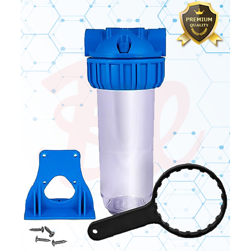 10" Transparent Standard Housing for Whole House Water Filtration System with 3/4" Inlet / Outlet Brass Ports - is proper to use for reducing sediment, dirt, rust, & suspended particles in incoming water to you house. The transparent housing body is made of reinforced polypropylene for strength and resistance to chemicals, and the blue cap and ring are made of high-flow polypropylene for toughness. The blue cap has 3/4" inlet / outlet brass ports which allowed better sealed connections to the corresponding pipes. There is rubber O-ring on the top of the housing body to ensure a watertight seal. A pressure relief button on the inlet side of the cap releases pressure in the housing for changing filter cartridges. This Housing for use in various applications and is usually placed in the main water line entering the house including, but not limited to residential drinking water filtration, food service, and irrigation. Easy to connect multiply housings in one Custom Whole House Water Filtration System to fit your specific needs. This Housing Can Be Used With Following 10” X 2.5” Filter Cartridges (Sold Separately): Sediment Water Filter Cartridge Pleated Washable Sediment Water Filter Cartridge Block Activated Carbon Water Filter Cartridge Granular Activated Carbon Water Filter Cartridge Special Water Filter Cartridge