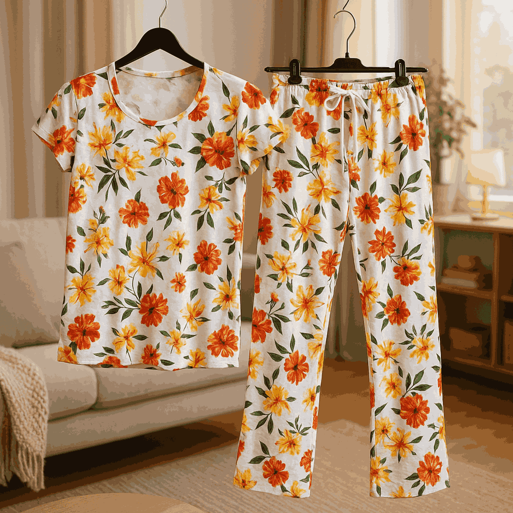 Woman Summer Wear Printed T-shirt and Trouser Set - Fashionable and Comfortable for All Seasons. ☘️উমাইশা ফ্যাশান নিয়ে এসেছে মেয়েদের আরামদায়ক রাতের পোশাক ☘️এখন ঘুম হবে প্রশান্তিতে ☘️।