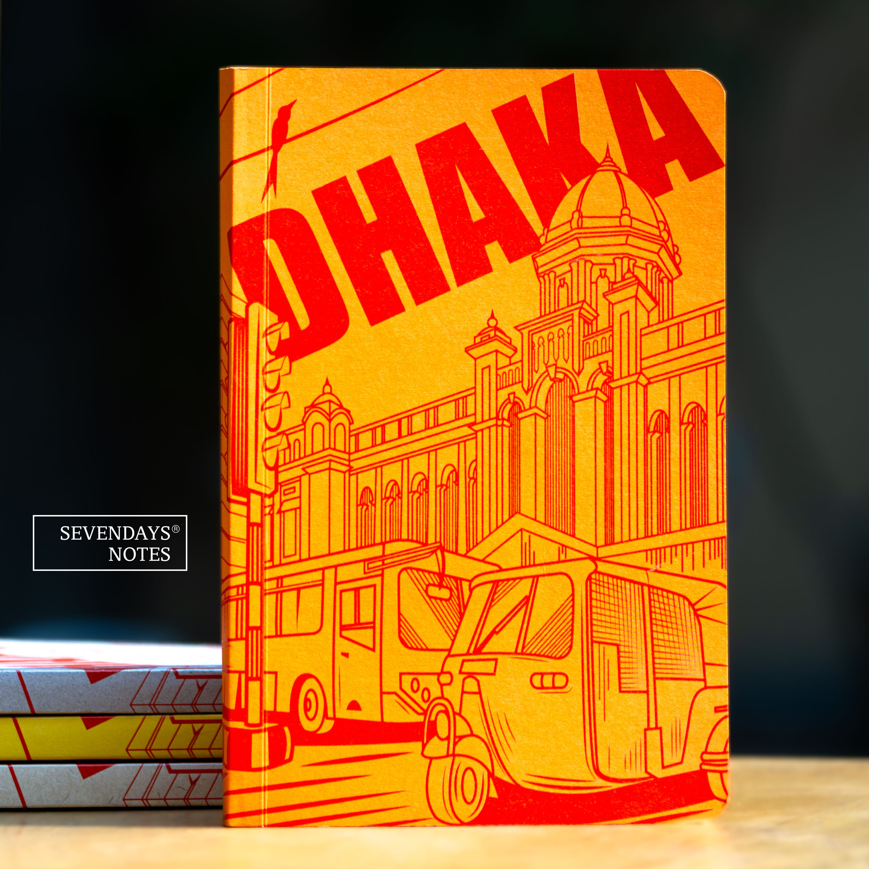 Describe of notebook SN202309382 1. Sevendays Notes made for you. 2. Cover Painting: “Dhaka (Line)” illustration by Gowtom Dasgupta. 3. Cover: Orange art card 300 gsm with a blend of 4-color prints, matt finish, and round cutting, with 120 gsm red top and back page. 4. Innards: Cream white recycled fine-lined paper. 5. Bound: Hand-stitched with perfect binding. 6. Size: W-5.4 in x H-8.4 in. 7. Page: 96 Leaves, 192 Pages.